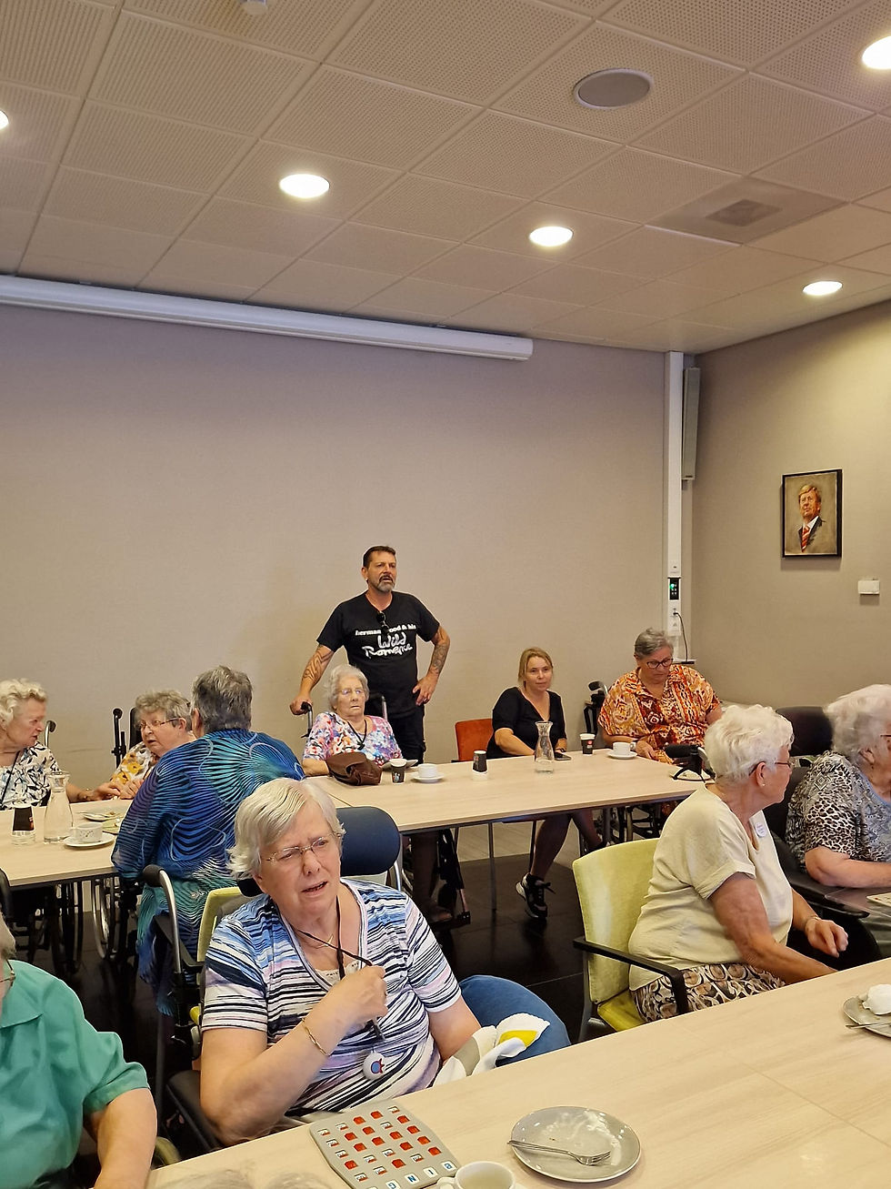 Nadat de ruimte was ingericht, was het tijd om de bewoners op te halen. Waar de ene erg naar de bingo had uitgekeken was er bij andere bewoners wat meer overtuigingskracht nodig om te komen. Iedereen werd verwelkomd met appeltaart met slagroom. Dat viel erg goed in de smaak.
