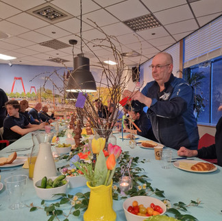 Vorige week is pasen op alle drie de vestigingen uitgebreid gevierd. In de vroege ochtend stond er een heerlijk ontbijtje klaar, compleet met broodjes, croissants, gebak, yoghurt en alles wat je maar kan wensen. En in de nog vroegere ochtend stonden een aantal enthousiaste collega’s klaar om alles voor te bereiden. Zij hebben geholpen met het klaarmaken van de versiering, lekkere pannenkoeken, gebakken eitjes en verse smoothies. Daarna was het tijd om een paaswens voor je collega op te schrijven en kon iedereen genieten van al het lekkers op tafel.