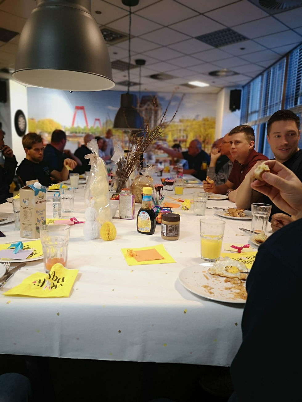 Afgelopen week hebben we twee heerlijke paasontbijtjes gehad in Oud-Beijerland en Schiedam. Precies om 7:00 liep de nieuwe kantine in Oud-Beijerland helemaal vol met mensen. Het was ontzettend leuk om te zien dat zo veel collega’s op het ontbijtje zijn afgekomen. Na de opening van het buffet, kon iedereen zich vergapen aan de buffettafel waarop allerlei paaslekkers, jus d’organge en zelf gemaakte gebakjes stonden. De tafels waren versiert met chocolade paashazen en paastakken. Met de paashazen en paasstollen hebben we een bijgedrage geleverd aan de Roparun, een estafette loop die zich inzet voor het goede doel. Op de borden lagen croissants en een kaartjes om een paaswens voor je collega op te schrijven. Met vrolijke glitterpennen zijn er paaswensen voor elkaar geschreven en in de paastakken gehangen.